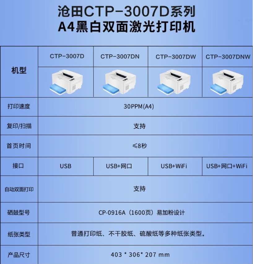 A4黑白打印机 沧田/CUMTENN CTP-3007DN